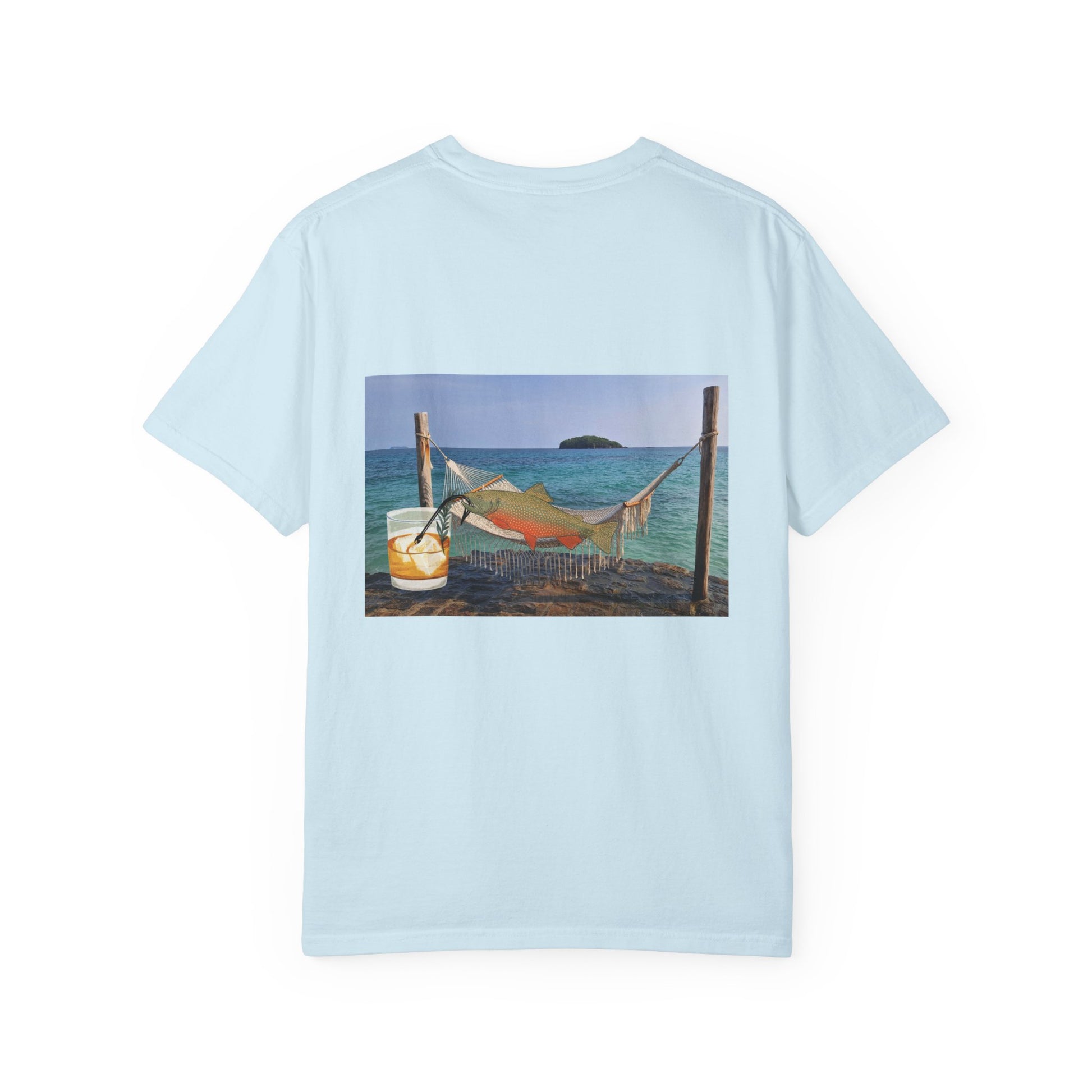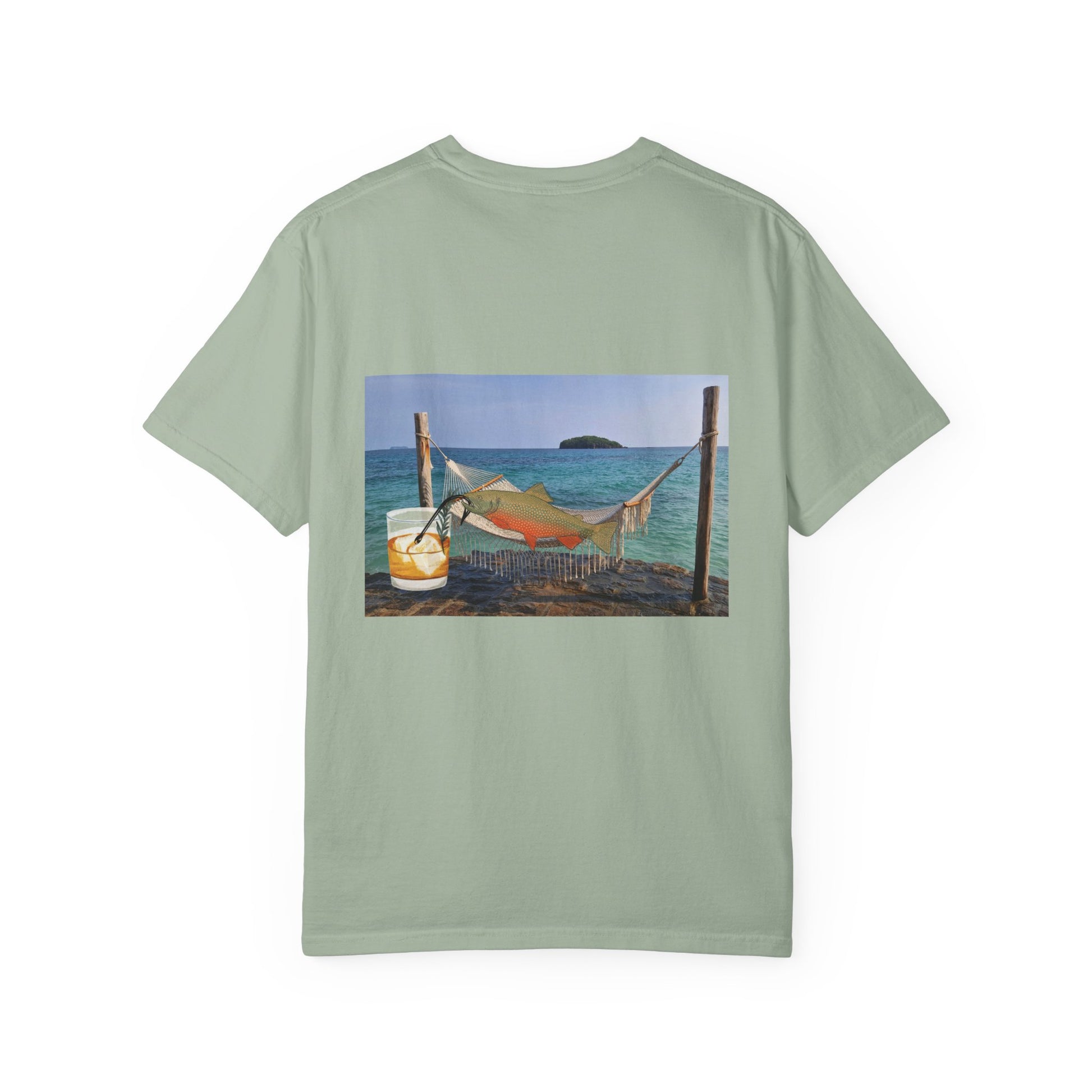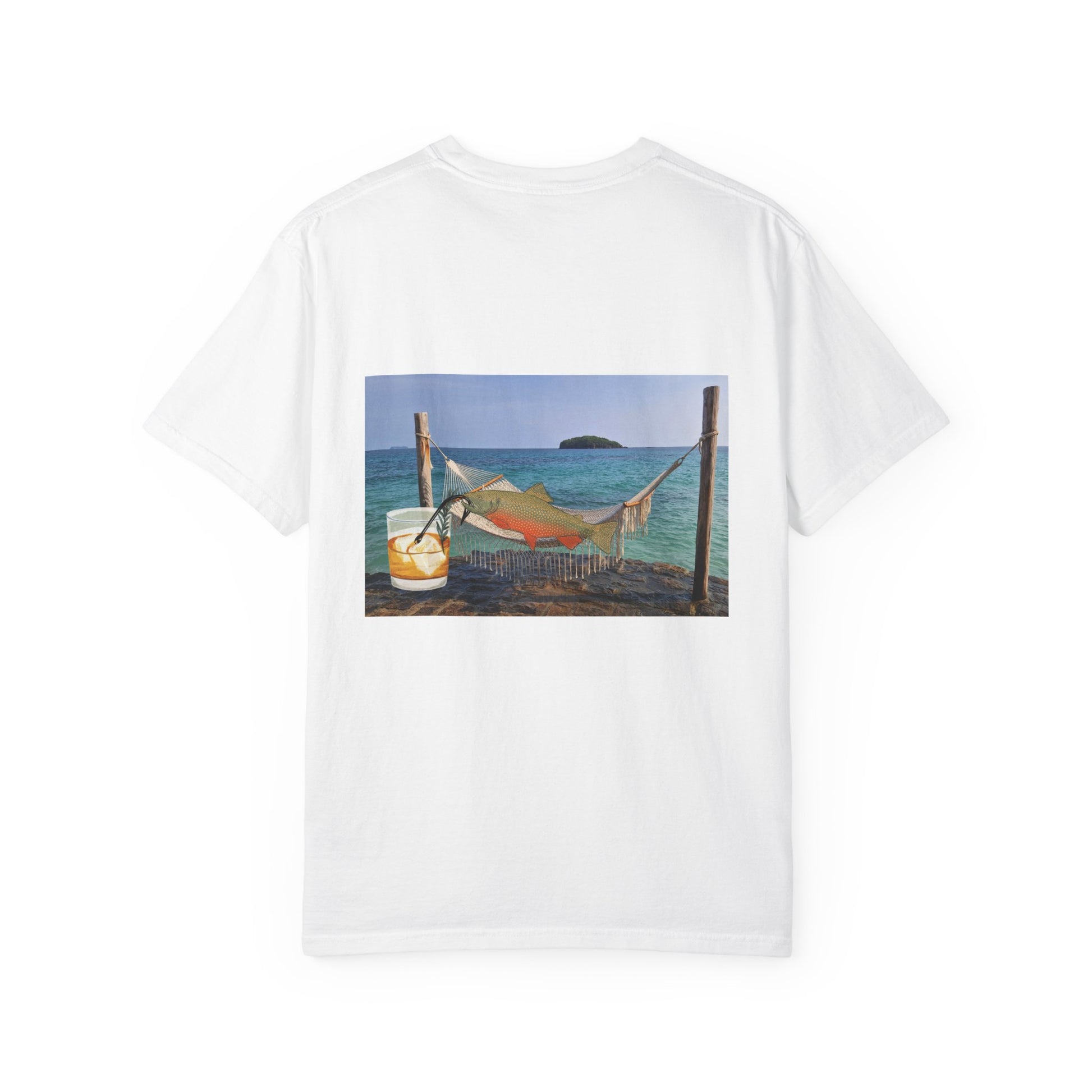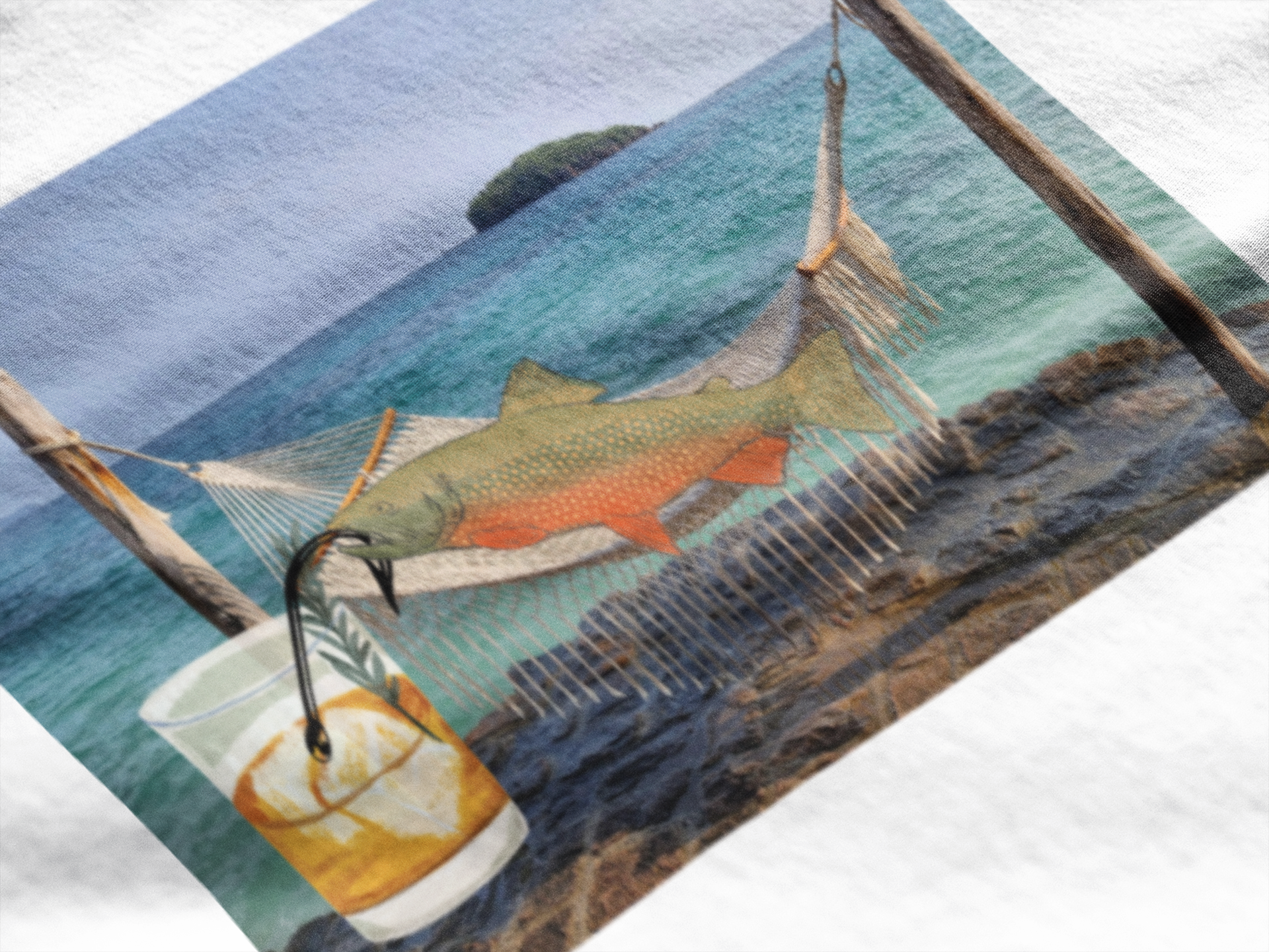 A shirt that blends the love of fishing, the outdoors, and a well-earned cocktail at the end of the day. On the front, a rainbow trout breaks the surface of misty waters, hooked onto a line that transforms into a straw dipping into a classic old fashioned. It’s a clever twist that captures the thrill of the catch and the joy of happy hour. On the back, the adventure continues—set against a dreamy tropical backdrop, a brook trout lounges in a hammock strung above turquoise waters, still tethered to the same old fashioned. The scene perfectly balances relaxation with the spirit of the outdoors. Printed on a premium, soft cotton tee, this design is ideal for anglers, adventurers, and anyone who knows the best stories are told over good drinks after a day outside.