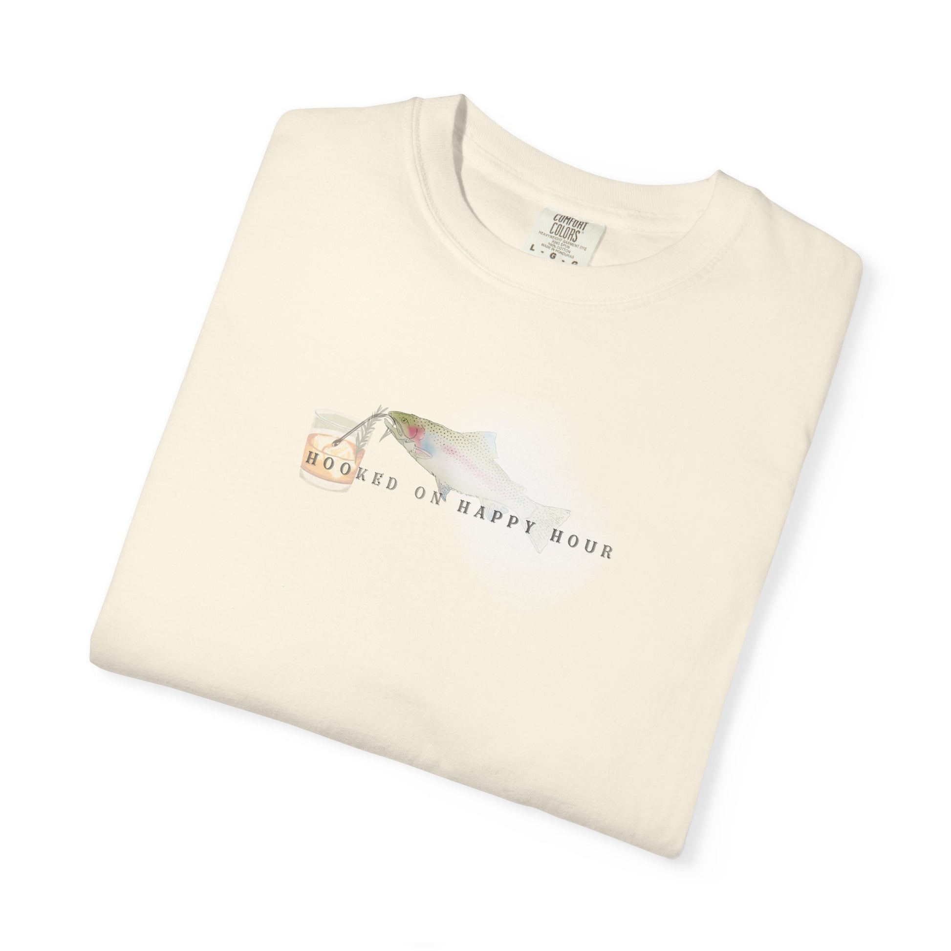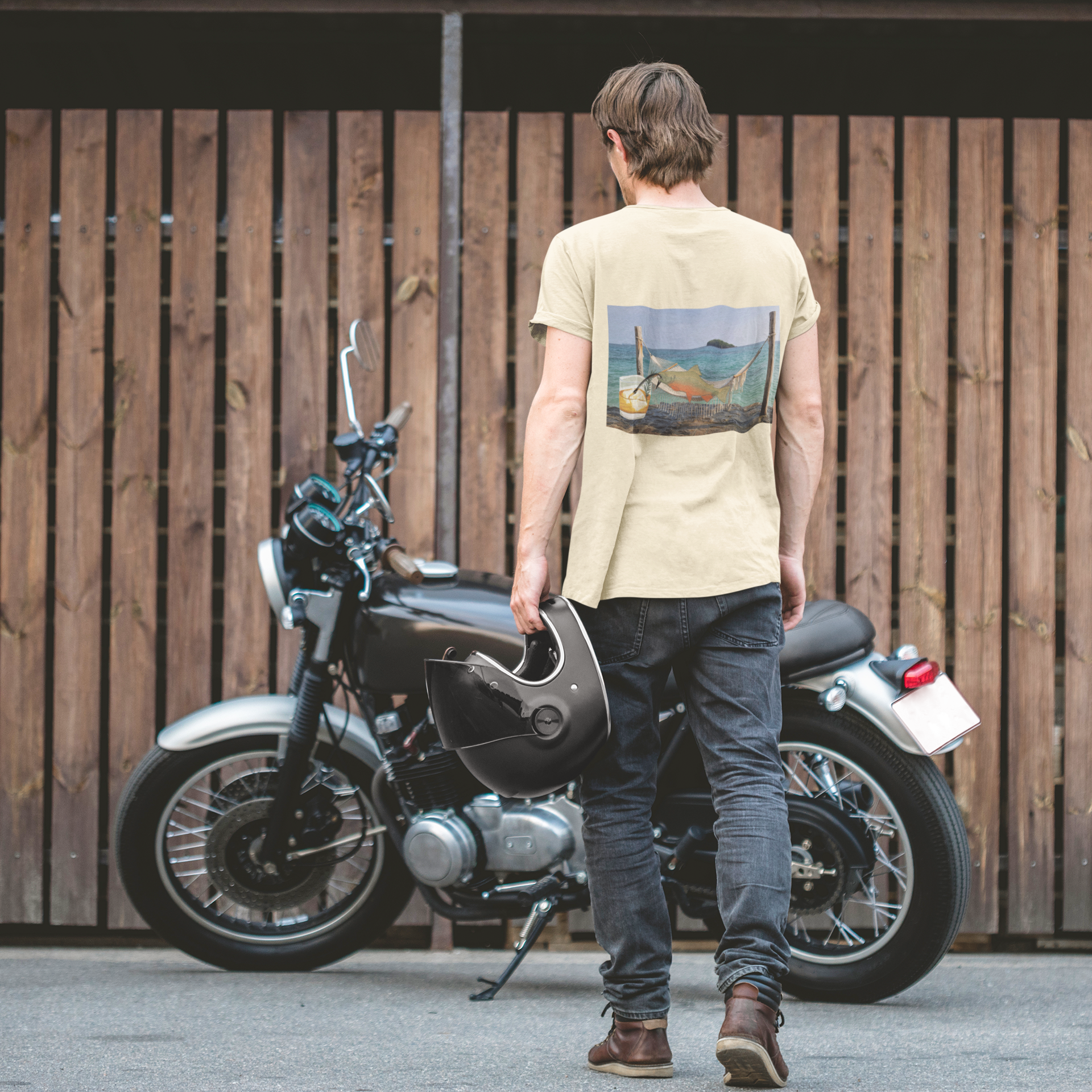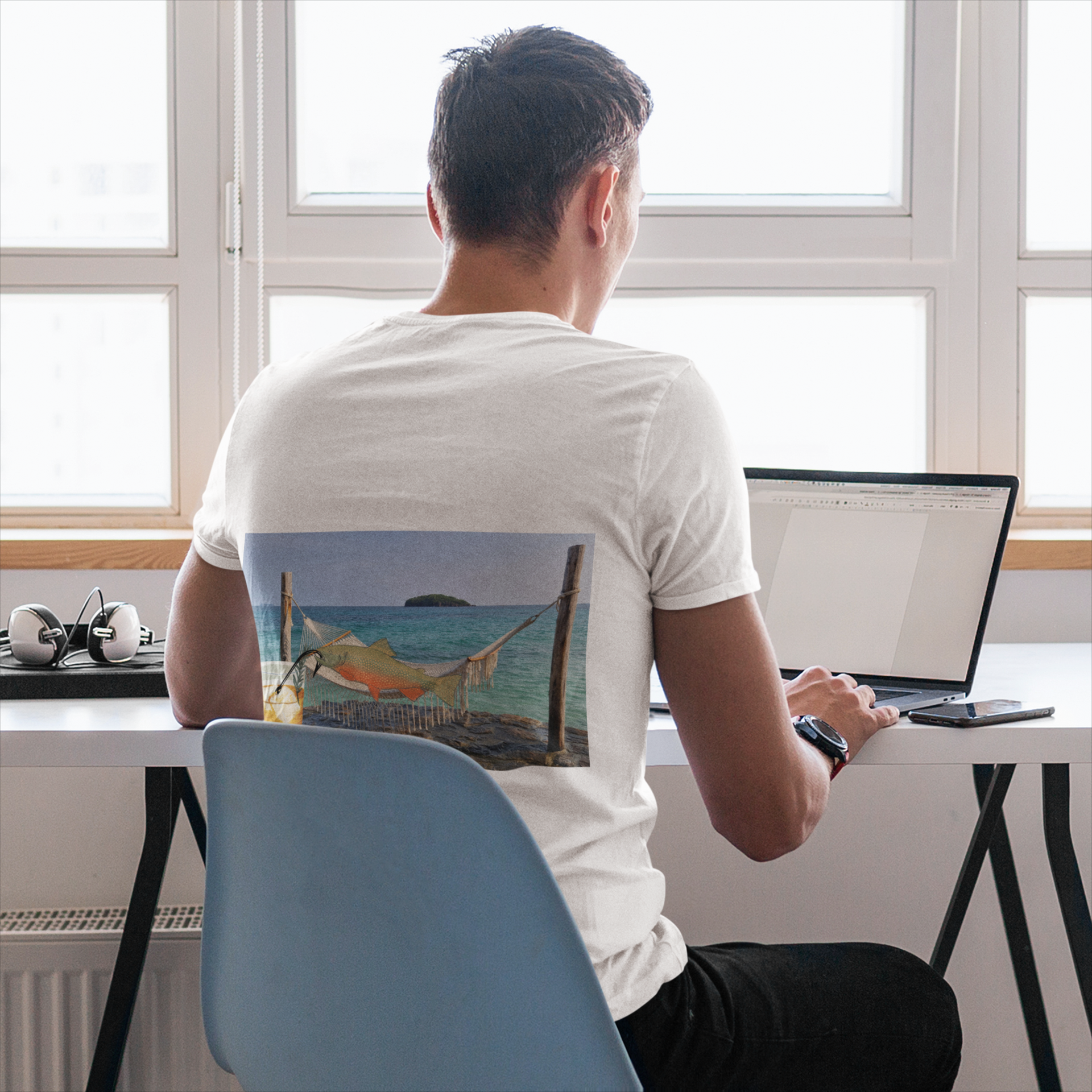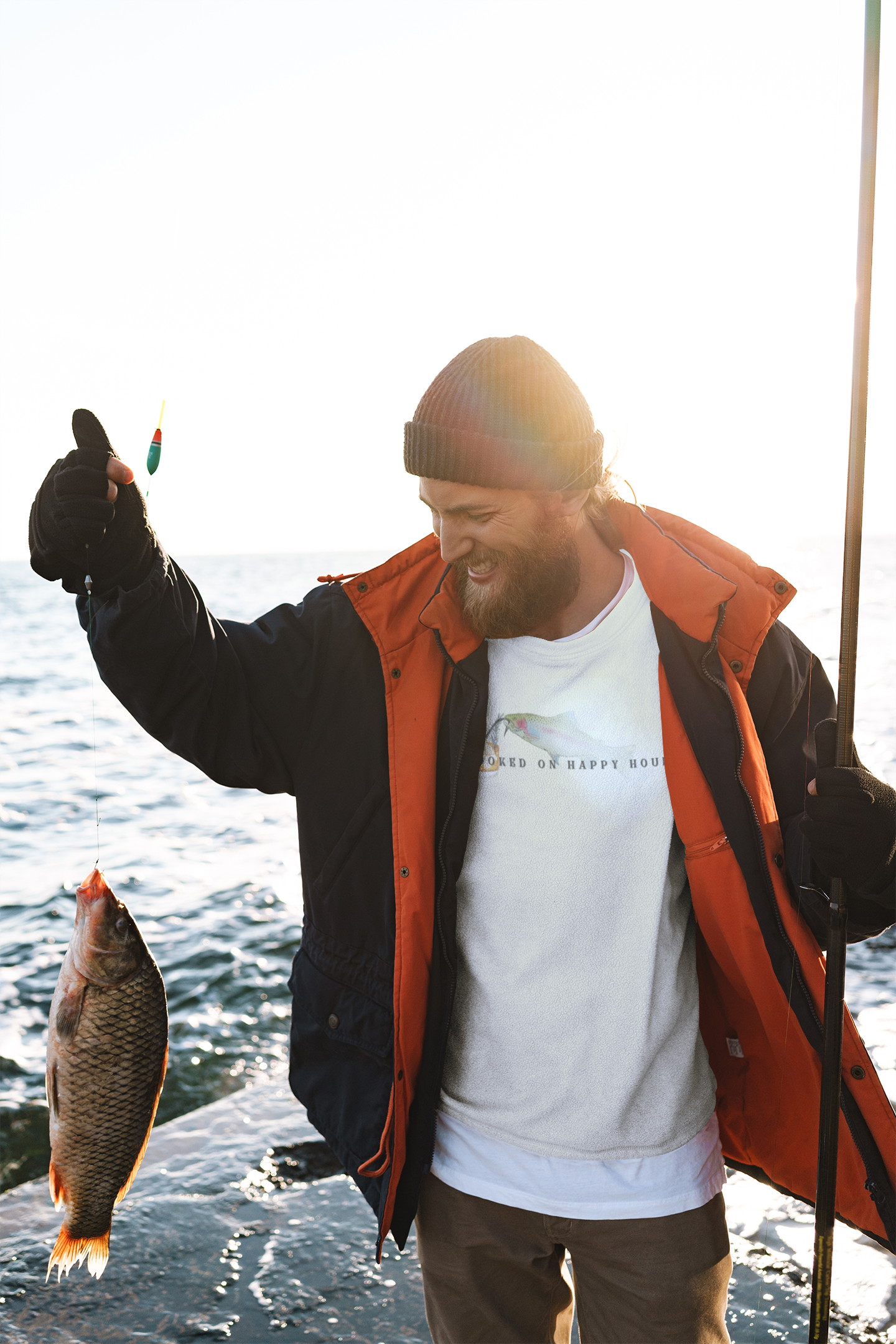 A shirt that blends the love of fishing, the outdoors, and a well-earned cocktail at the end of the day. On the front, a rainbow trout breaks the surface of misty waters, hooked onto a line that transforms into a straw dipping into a classic old fashioned. It’s a clever twist that captures the thrill of the catch and the joy of happy hour. On the back, the adventure continues—set against a dreamy tropical backdrop, a brook trout lounges in a hammock strung above turquoise waters, still tethered to the same old fashioned. The scene perfectly balances relaxation with the spirit of the outdoors. Printed on a premium, soft cotton tee, this design is ideal for anglers, adventurers, and anyone who knows the best stories are told over good drinks after a day outside.